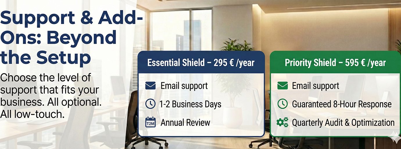 Support Plans and Optional Add‑Ons Choose the level of support that fits your business. All optional. All low‑touch.…